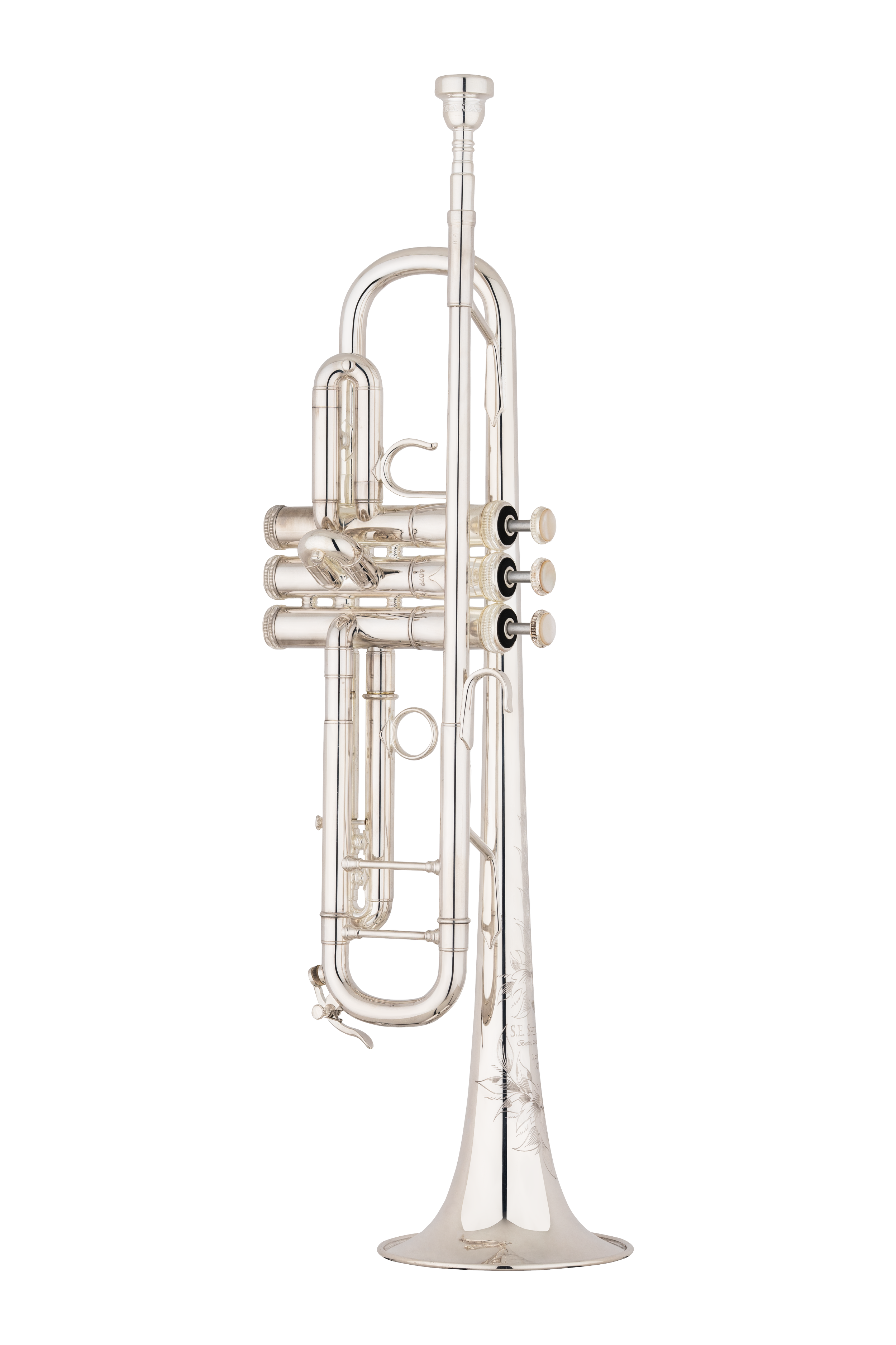 Bell Engraving: S.E. Shires makers mark, model designation, and traditional floral pattern